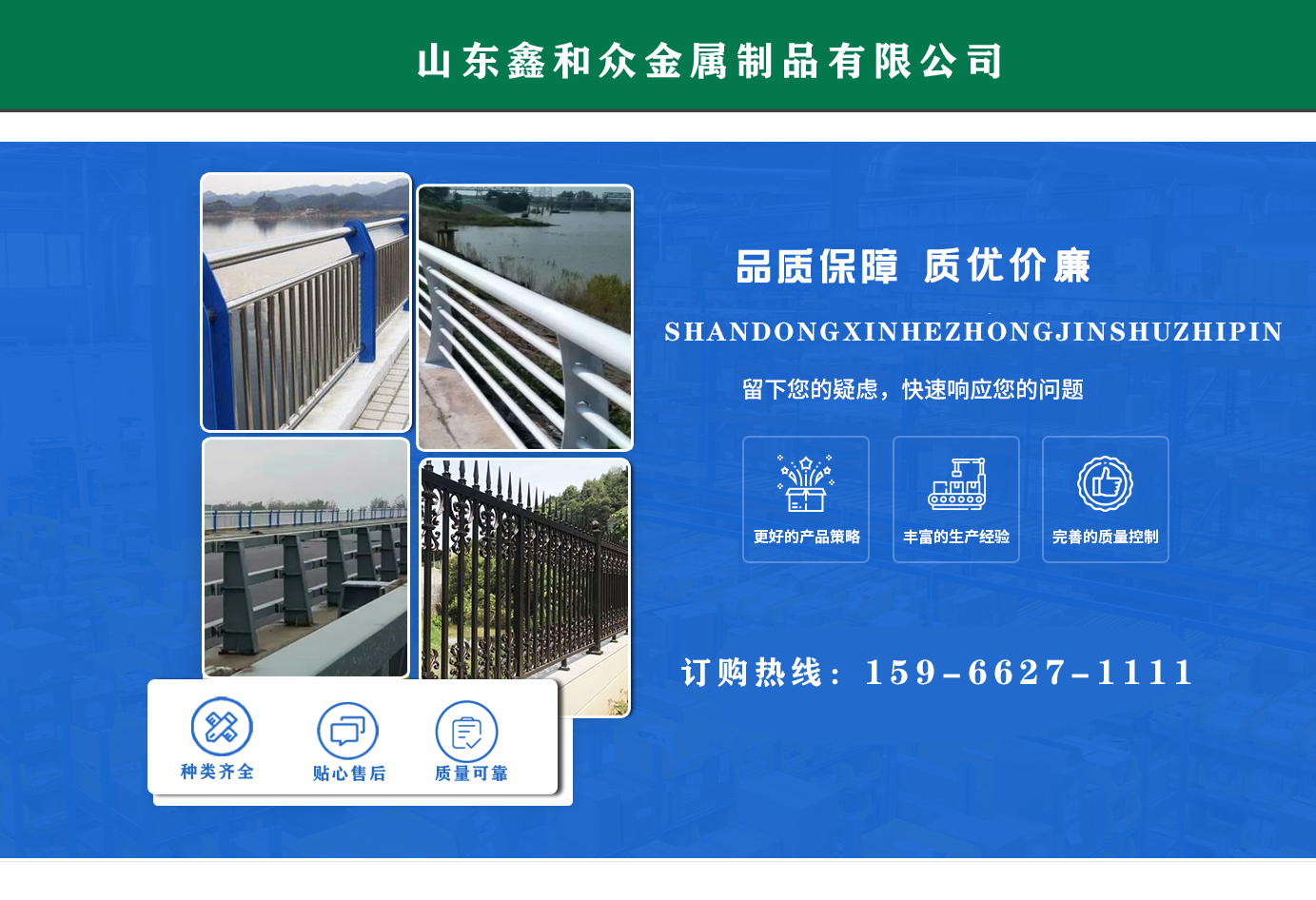 山東鑫和眾金屬制品有限公司主要產品有防撞護欄,橋梁護欄,道路護欄,河道護欄,不銹鋼護欄等護欄。提供設計方案,一站式定制,包您滿意價格優(yōu)惠,歡迎來電咨詢! 公司常年從事銷售護欄防撞護欄,橋梁護欄,道路護欄,河道護欄,不銹鋼護欄,橋梁鋼護欄,河道燈光護欄等。產品廣泛應用于橋梁、河道、旅游景區(qū)、道路、公路、公園、小區(qū)、景觀、道路防撞等領域。 公司產品均采用優(yōu)質不銹鋼材料,符合相關標準。各種型號不銹鋼復合管及護欄,質量嚴格把控。產品強度高、耐腐蝕、焊接牢固、抗沖擊、性能好,防撞護欄結構簡單、美觀實用大方。 歡迎前來訂購!...